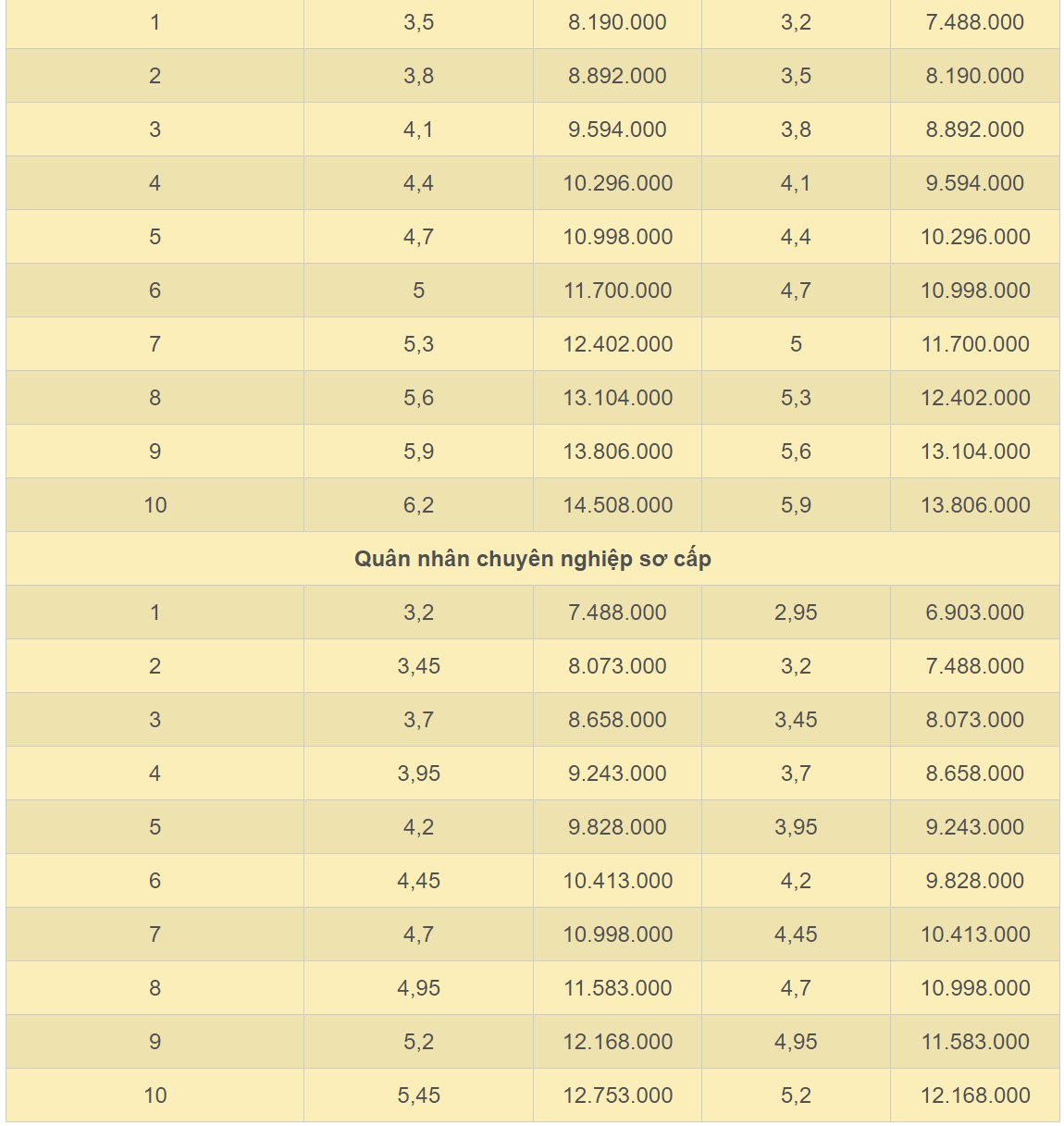 10,4 18.720.000 24.336.000 Thượng tượng 9,8 17.640.000 22.932.000 Trung tướng 9,2 16.560.000 21.528.000 Thiếu tướng 8,6 15.480.000 20.124.000 Đại tá 8 14.400.000 18.720.000 Thượng tá 7,3 13.140.000 17.082.000 Trung tá 6,6 11.880.000 15.444.000 Thiếu tá 6 10.800.000 14.040.000 Đại úy 5,4 9.720.000 12.636.000 Thượng úy 5 9.000.000 11.700.000 Trung úy 4,6 8.280.000 10.764.000 Thiếu úy 4,2 7.560.000 9.828.000 Thượng sỹ 3,8 6.840.000 8.892.000 Trung sỹ 3,5 6.300.000 8.190.000 Hạ sỹ 3,2 5.760.000 7.488.000
