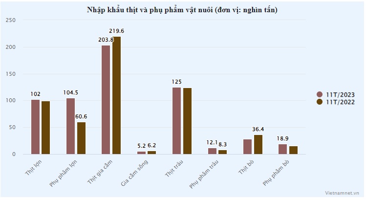Cụ thể, trong 11 tháng năm 2023, nước ta nhập khẩu gần 102.000 tấn thịt lợn và gần 104.500 tấn phụ phẩm lợn; nhập 203.800 tấn thịt gia cầm, 5.200 tấn gia cầm sống; thịt trâu hơn 125.000 tấn, phụ phẩm từ trâu hơn 12.100 tấn; thịt bò 28.200 tấn, phụ phẩm bò 18.900 tấn.