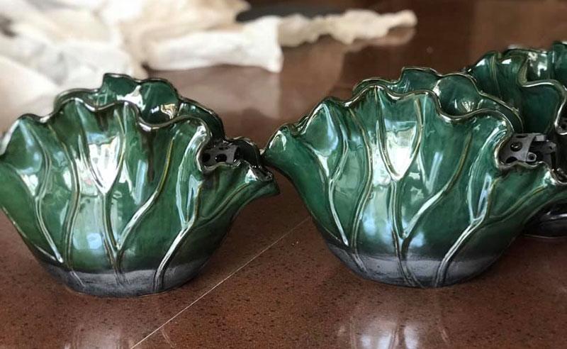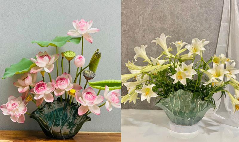 Nhưng riêng với mẫu bình chiếc lá sen thì dễ dàng hơn. Chị em yêu thích hoa tươi không cần quá khéo tay cũng có thể cắm được một bình bông đẹp. Bởi phần miệng hến lá sen có độ mở vừa phải, bên trong dùng miếng định hình để hoa cắm vào có khoảng cách đều nhau.