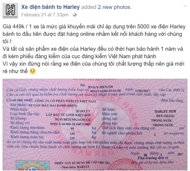 Trang mạng xã hội với tên gọi "Xe điện bánh to Harley" được cho là đang bán 30.000 xe điện dùng phiếu kiếm tra chất lượng xuất xưởng giả với giá "khuyến mại" 499.000 đồng.