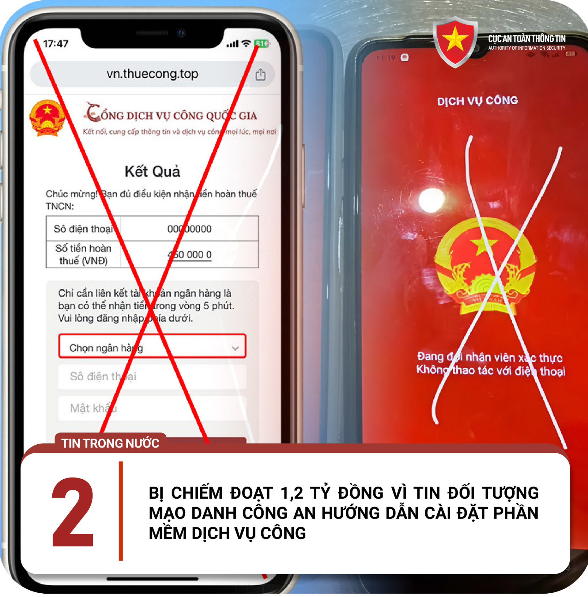 Một người dân sống tại phường Trung Hòa, quận Cầu Giấy (Hà Nội) vừa bị đối tượng mạo danh công an lừa chiếm đoạt 1,2 tỷ đồng, với chiêu trò hướng dẫn cài ứng dụng dịch vụ công trực tuyến giả mạo. Ứng dụng giả mạo này được đối tượng lừa đảo gửi qua đường dẫn đính kèm trong tin nhắn, sau khi liên hệ và thông báo tài khoản định danh của nạn nhân bị lỗi, phải cài ứng dụng để được hỗ trợ từ xa. Khi nạn nhân làm theo hướng dẫn, kẻ lừa đảo sẽ chiếm được quyền điều khiển thiết bị, từ đó chiếm đoạt tiền trong tài khoản ngân hàng của nạn nhân.