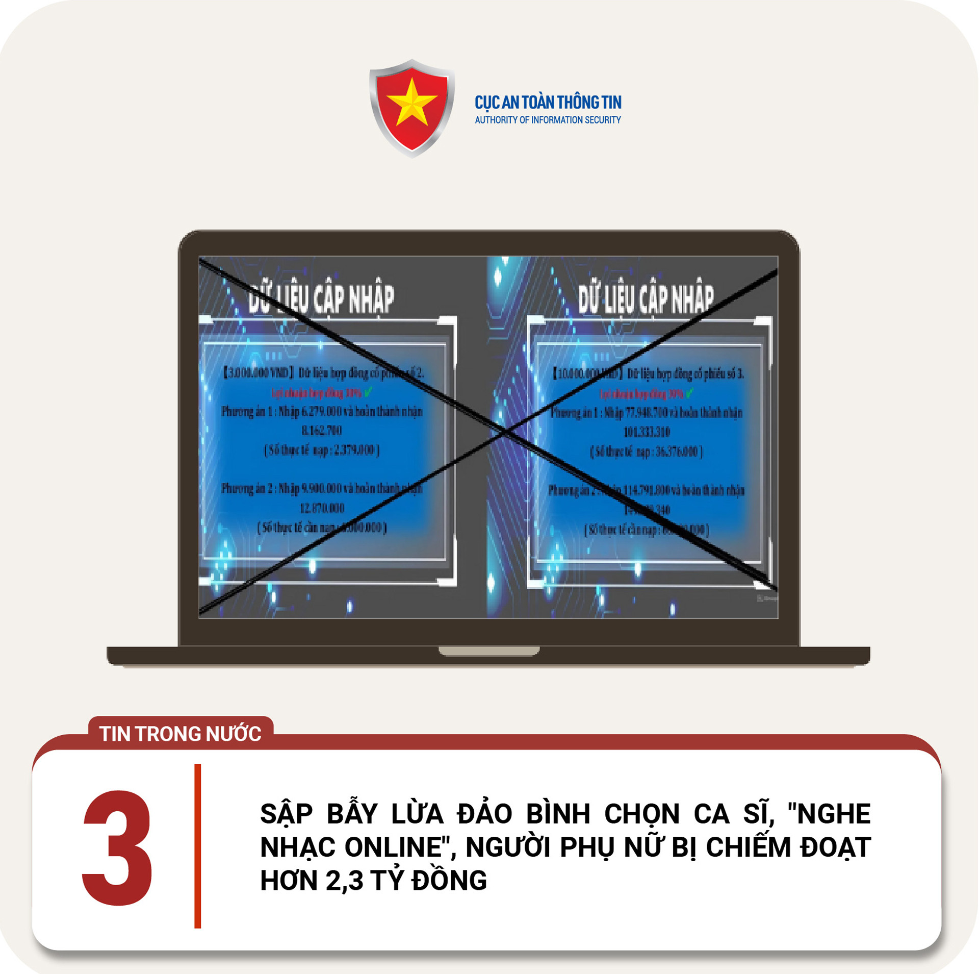Một phụ nữ sống tại thị xã Chơn Thành (Bình Phước) vừa bị đối tượng xấu lừa chiếm đoạt hơn 2,3 tỷ đồng, qua thủ đoạn biến tướng của hình thức lừa đảo ‘Việc nhẹ, lương cao’. Cụ thể, đối tượng kết bạn cho nạn nhân qua Telegram, sau đó giới thiệu cho nạn nhân việc làm thêm tại nhà – ‘nghe các bài nhạc được chỉ định, đăng nhập và bỏ phiếu bình chọn ca sĩ’, với thù lao được hứa hẹn là 35.000 đồng/lượt bình chọn. Sau khi đồng ý tham gia, tải ứng dụng Zing MP3 giả mạo và ứng tiền đặt cọc để thực hiện các nhiệm vụ theo sự dẫn dụ của các đối tượng, nạn nhân đã bị chiếm đoạt toàn bộ số tiền đã chuyển.