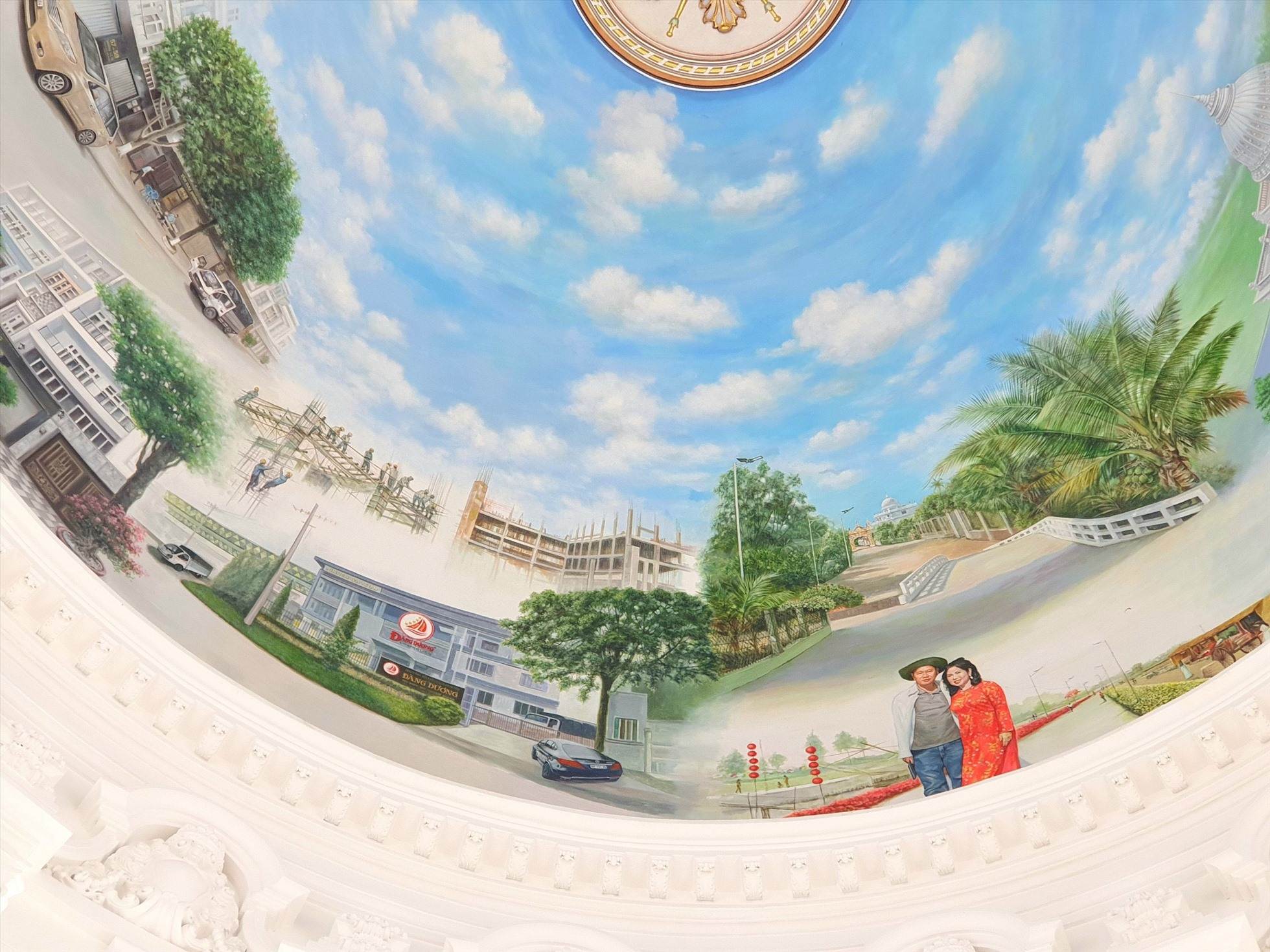 Trần nhà được ốp gỗ rất cầu kỳ, sau đó dát vàng. Trên mái vòm, ông thuê người vẽ tranh kể về cuộc đời của vợ chồng mình, từ thuở cơ hàn đến nay.