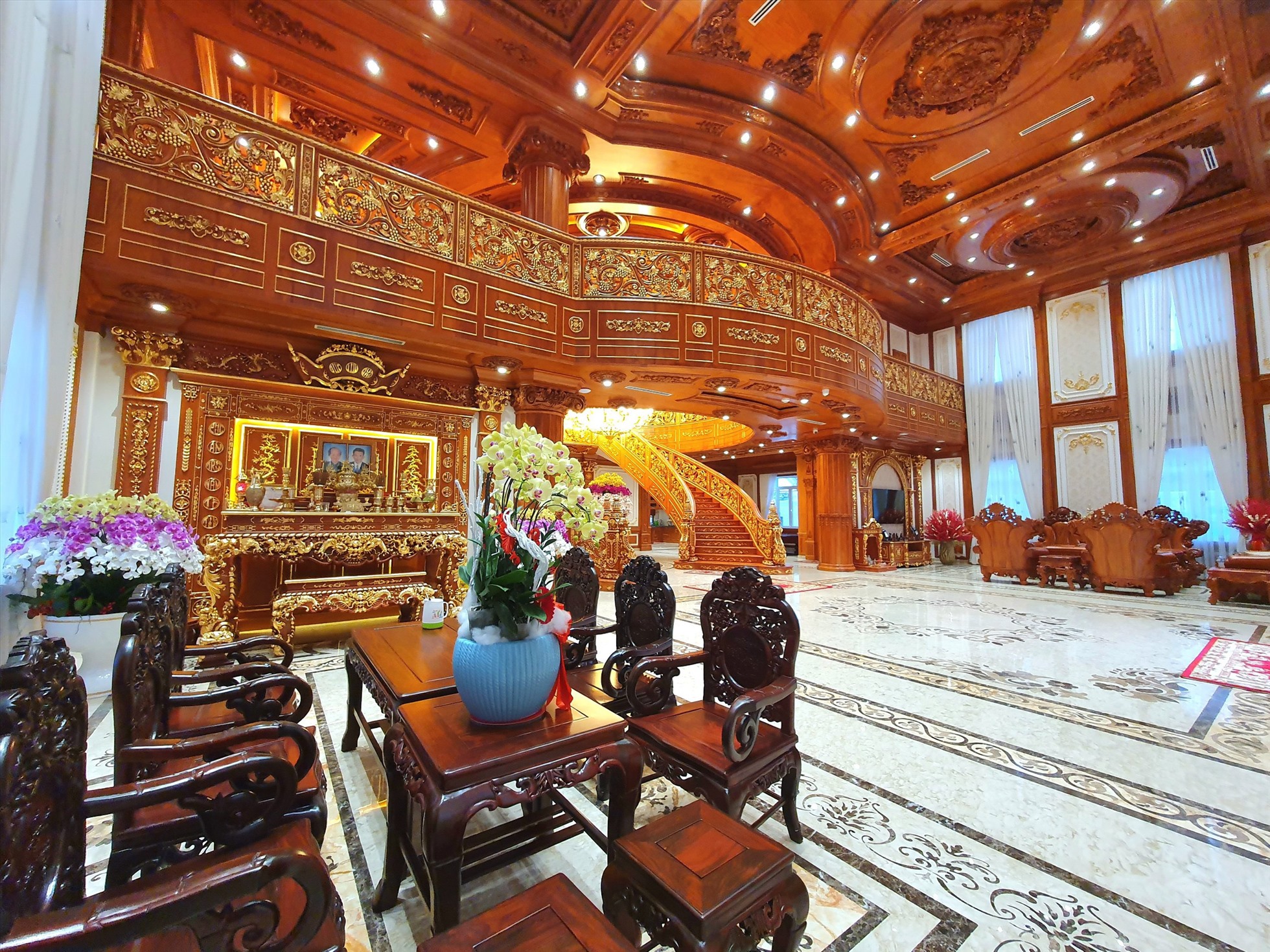 Ông Nguyễn Ngọc Lang rất tâm đắc với dinh thự của mình, đặc biệt là cầu thang gỗ uốn lượn ở sảnh chính. Ông tiết lộ, cầu thang này được lấy cảm hứng thiết kế từ chiếc cầu thang trong nhà Anandi - nhân vật trong phim "Cô dâu 8 tuổi" mà ông rất thích.