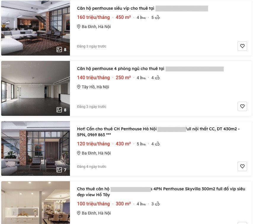 Đơn cử, căn penthouse tại một dự án hạng sang tại phường Trúc Bạch (Ba Đình, Hà Nội) có diện tích 450m2, 4 phòng ngủ, được giới thiệu là “siêu VIP” hiện đang được chào thuê với giá 160 triệu đồng/tháng. Như vậy, tiền thuê 1 năm là 1,92 tỷ đồng, tương đương 1 căn chung cư cũ có 2 phòng ngủ tại các huyện Gia Lâm, Đông Anh, Hoài Đức,... thậm chí chí ngang ngửa một số căn tại quận Nam Từ Liêm, Bắc Từ Liêm,...