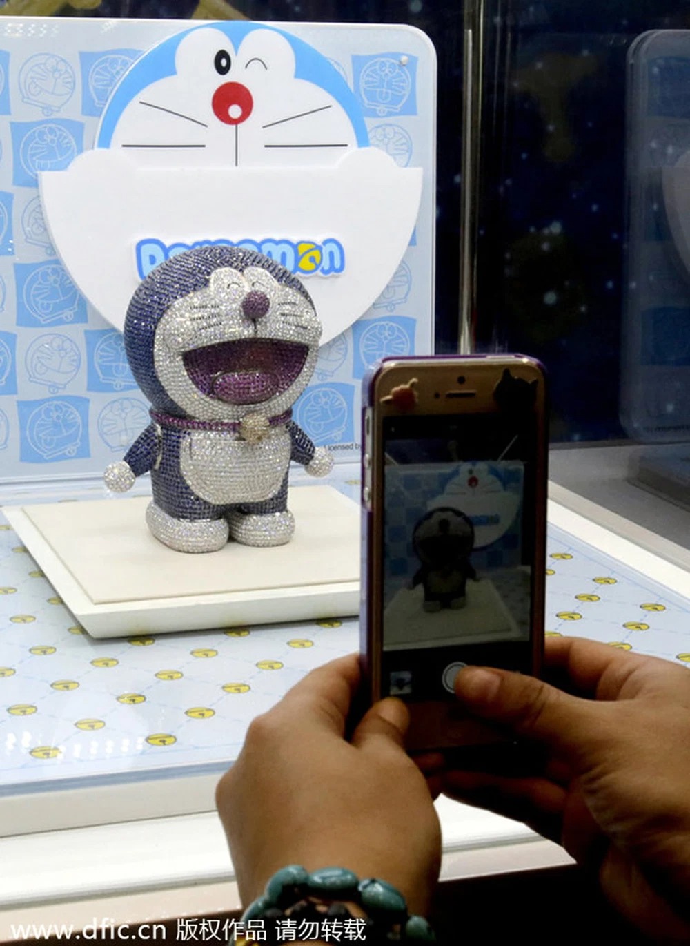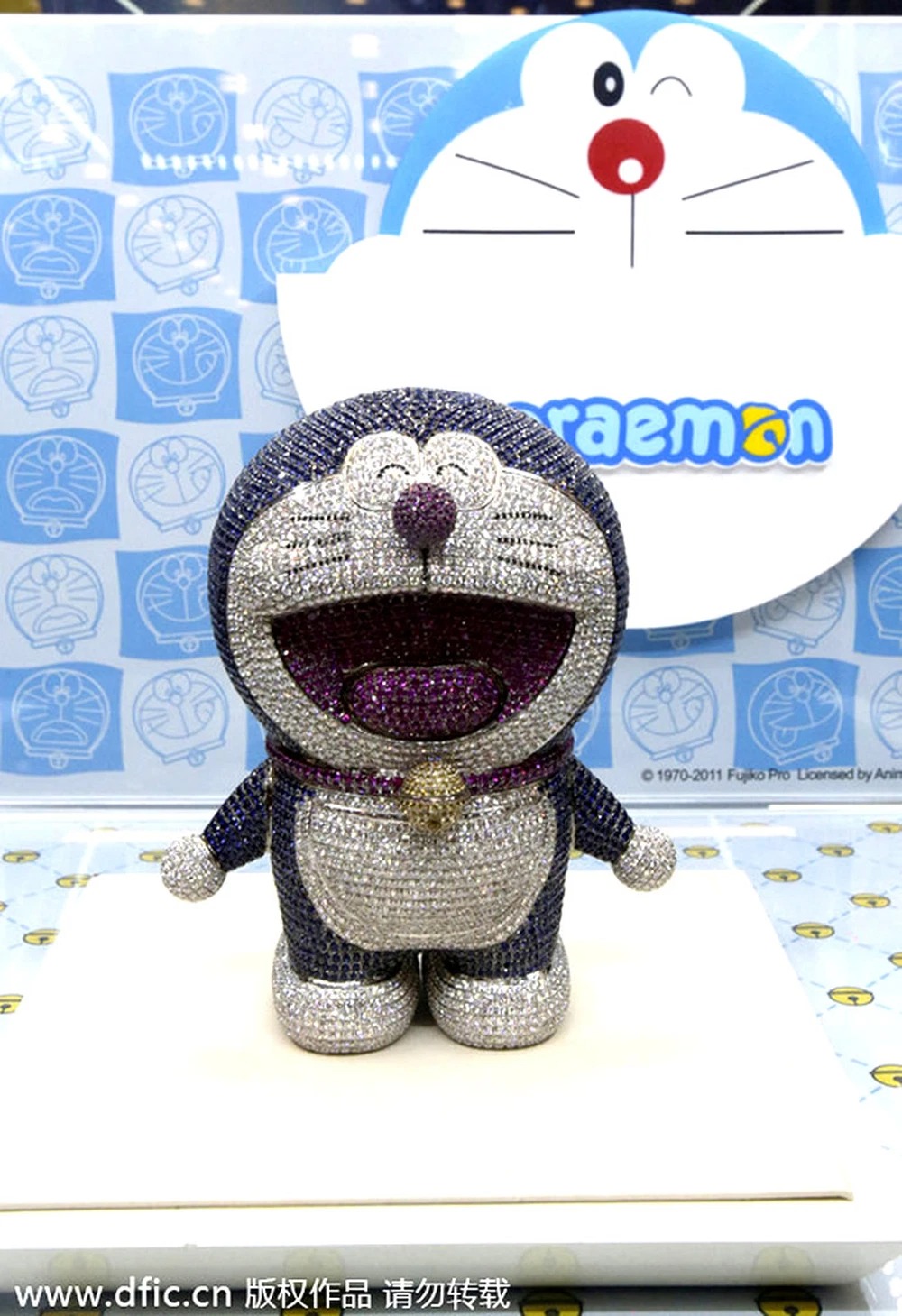 Theo Nhật báo China Daily, chú mèo máy Doraemon đắt nhất thế giới bao gồm 2.342 viên kim cương, 861 viên hồng ngọc, 4.074 viên ngọc bích được ghi nhận trị giá 8 triệu nhân dân tệ (1,28 triệu USD). Vật phẩm này từng được trưng bày tại World Trade Plaza ở tỉnh Hồ Bắc, miền Trung Trung Quốc, vào ngày 1/6/2014.