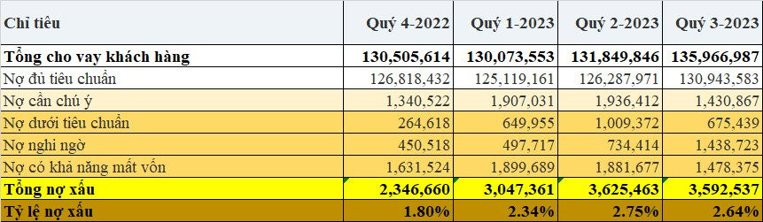 Trong đó, Nợ dưới tiêu chuẩn (nợ nhóm 3) tăng hơn 2,5 lần so với đầu năm, lên 675 tỷ đồng; Nợ nghi ngờ (nợ nhóm 4) tăng gần 3,2 lần so với đầu năm, lên 1.438 tỷ đồng. Nợ có khả năng mất vốn (nợ nhóm 5) bất ngờ giảm gần 9,4% so với đầu năm, còn 1.478 tỷ đồng.
