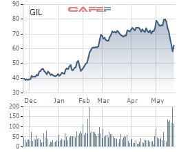 Một trường hợp khá "đau xót" với nhà đầu tư là GIL khi cổ phiếu sau giai đoạn thăng hoa đầu năm đã bất ngờ giảm sâu những ngày gần đây. Từ đỉnh 80.000 đồng vào phiên 13/5, GIL đã có chuỗi phiên giảm liên tiếp và thậm chí đến ngày 21/5 chỉ còn 58.300 đồng, tương ứng mức giảm 27% so với đỉnh chỉ trong vài phiên giao dịch.