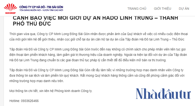 "Tập đoàn Hà Đô và Công ty CP Minh Long Đông Sài Gòn rất lấy làm tiếc vì những trường hợp mạo danh nhân viên Công ty đưa thông tin sai lệch và làm phiền tới quý khách. Rất mong quý khách hàng thông cảm và cũng đề phòng cảnh giác đối với những trường hợp mạo danh nêu trên", Tập đoàn Hà Đô cảnh báo.