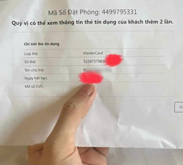 Khi anh H. vừa tới khách sạn nhận phòng, nhân viên đưa thông tin đầy đủ về thẻ tín dụng của anh đã điền trên Agoda. Thậm chí, thông tin thẻ còn được in ra và các nhân viên lễ tân cũng xem thoải mái! Thông tin thẻ được in ra gồm đầy đủ dãy số thẻ và cả mã số bí mật (3 số CVV).