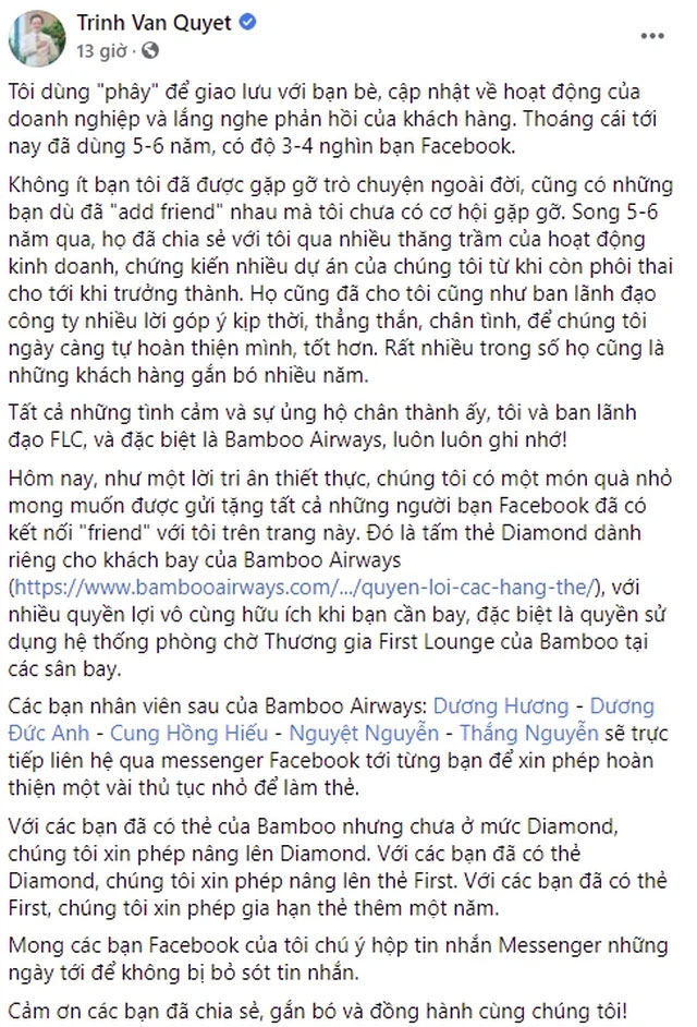 Hồi đầu năm, ông Quyết từng hào phóng tặng quà cho tất cả những ai kết bạn với ông trên Facebook, là những tấm thẻ Diamond của Bamboo Airways, hoặc nâng cấp thẻ cho những ai đã sử dụng thẻ Diamond.