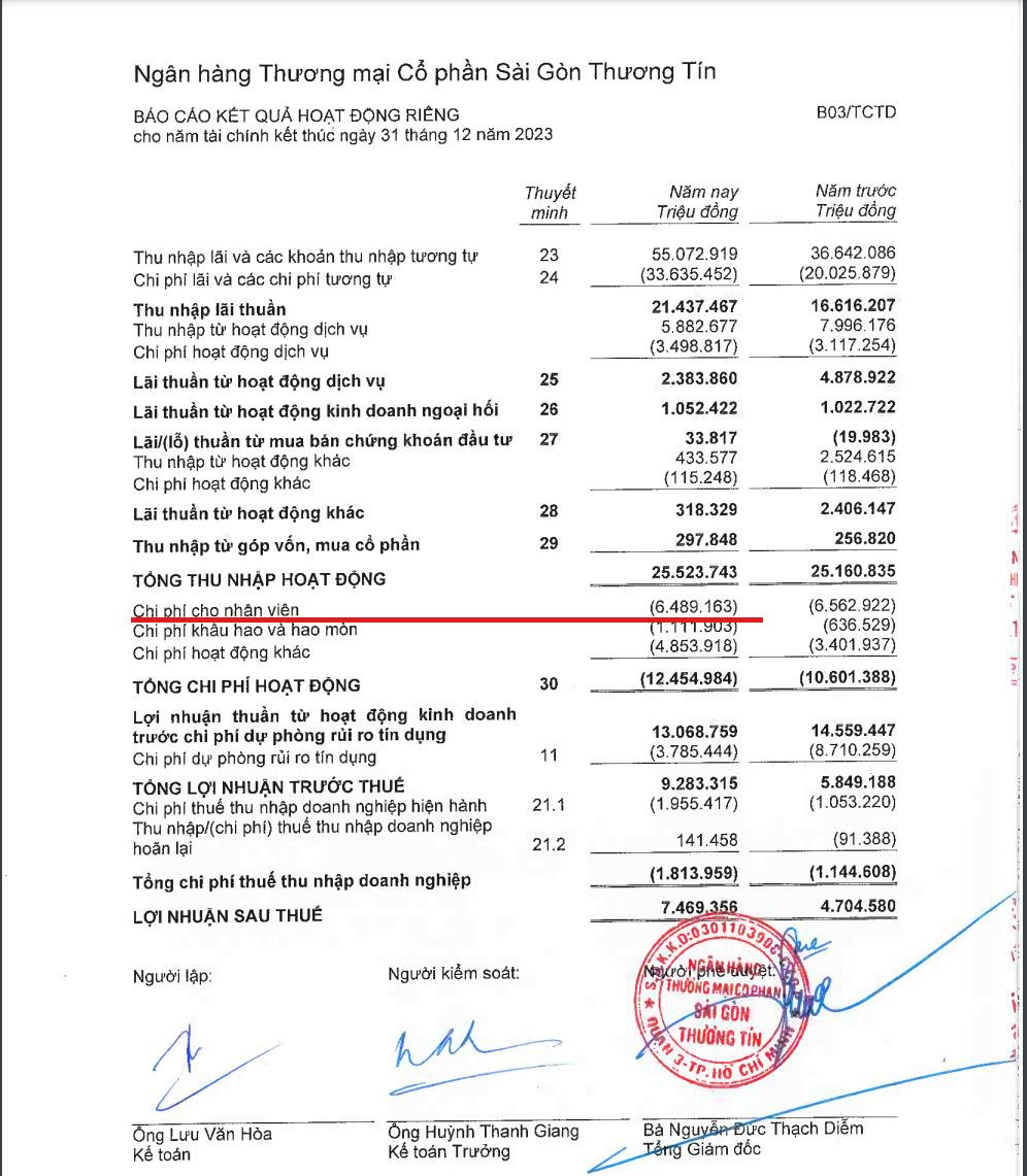 Trong khi đó, tại Báo cáo lưu chuyển tiền tệ riêng kiểm toán năm 2023, Sacombank công bố hạng mục "Tiền chi trả cho nhân viên và hoạt động quản lý, công vụ" trong năm 2023 ở mức hơn 11.064 tỷ đồng.