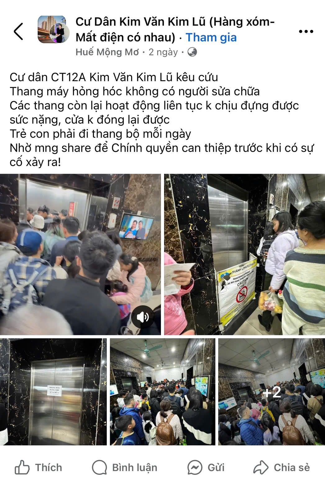 Từ ngày 7/1/2025, nhiều cư dân sinh sống tại Tòa nhà Chung cư CT12A – Kim Văn, Kim Lũ (phường Đại Kim, quận Hoàng Mai, Hà Nội) liên tục phản ánh trên các nhóm cư dân về vấn đề ùn tắc nghiêm trọng vào các giờ cao điểm tại khu vực sảnh thang máy do thang máy hỏng nhưng chưa được sửa chữa.