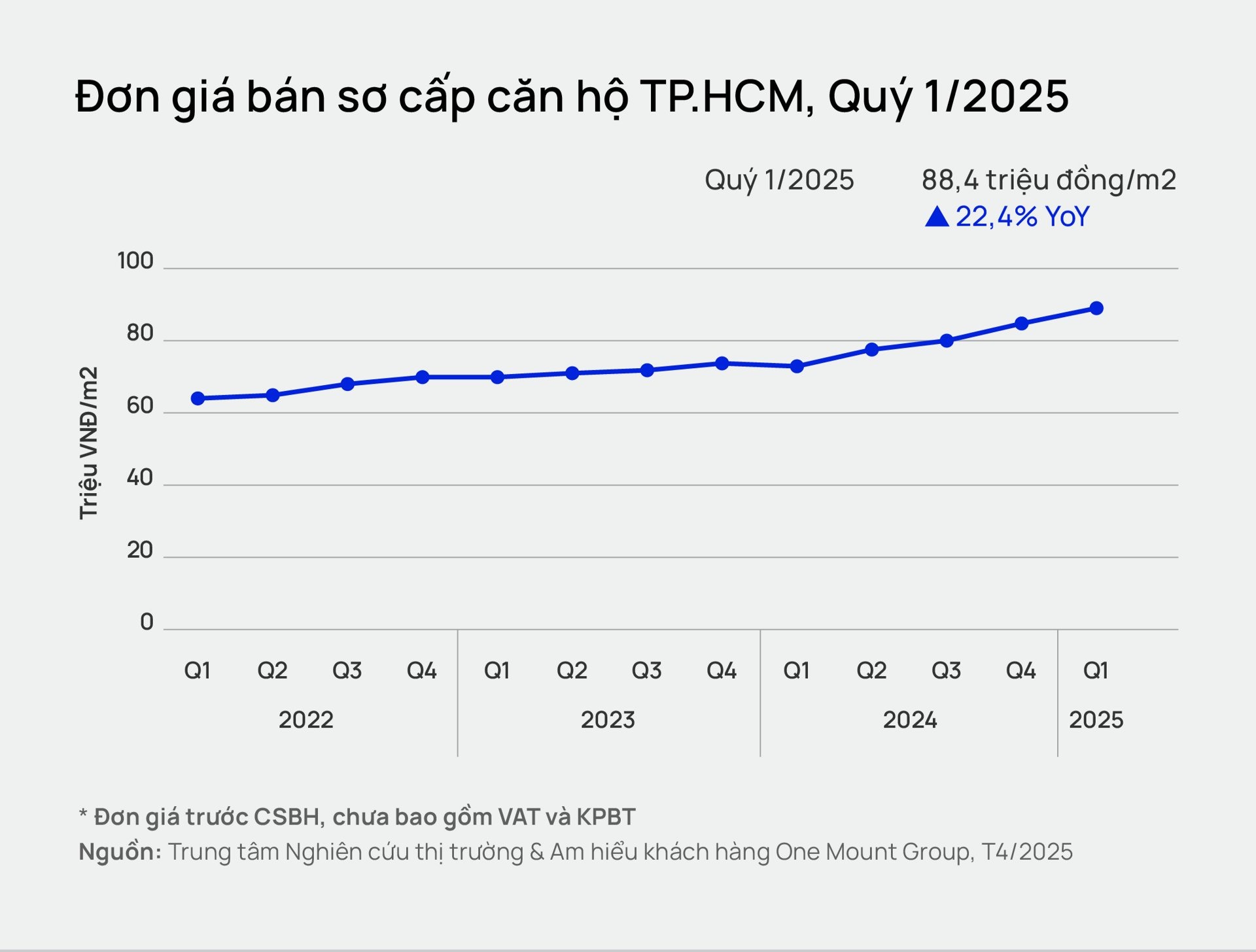 Trái ngược với nguồn cung mở mới suy giảm, giá bán căn hộ sơ cấp tiếp tục tăng mạnh. Mức giá trung bình toàn thị trường đạt 88,4 triệu đồng/m², tăng 4,9% so với quý trước và tăng tới 22,4% so với cùng kỳ năm ngoái.