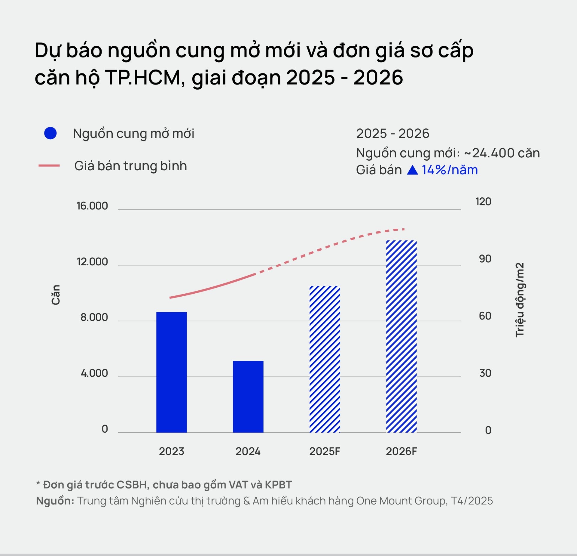 Trung tâm Nghiên cứu thị trường & Am hiểu khách hàng One Mount Group dự báo cho giai đoạn 2025–2026, thị trường căn hộ TP HCM có thể đón nhận khoảng 24.400 căn hộ mở bán mới, tăng 4.400 căn so với dự báo trước đó. Mức tăng chủ yếu đến từ các dự án đại đô thị quy mô lớn như Vinhomes Green Paradise và The Global City, cùng với các dự án đã được tháo gỡ pháp lý của NovaLand, Đất Xanh Group...