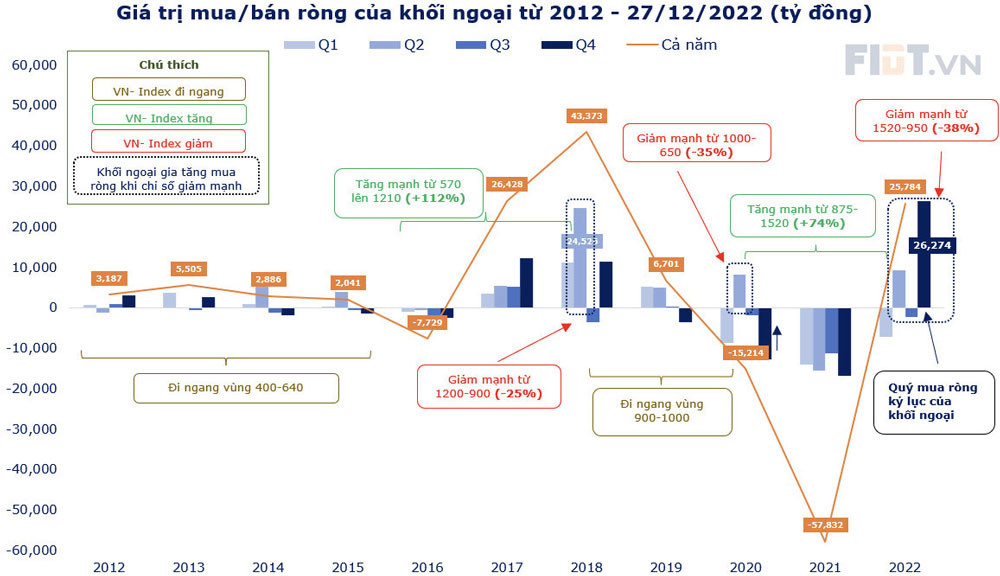 Trong năm 2022, giá cổ phiếu giảm mạnh và VN-Index từ đỉnh cao 1.520 điểm hồi đầu tháng 4 về 873 điểm, khối ngoại đã có 6 tháng mua ròng cổ phiếu Việt, trong tổng số 12 tháng.