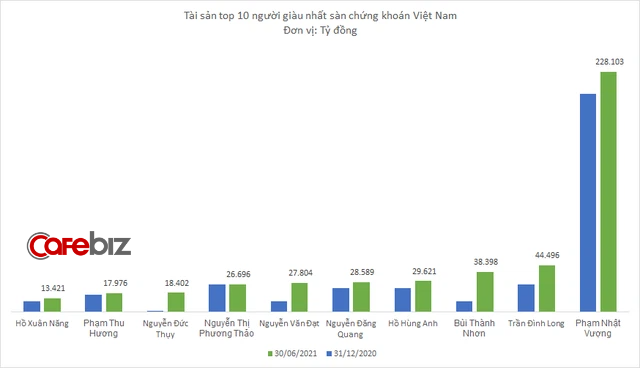 | Biến động tài sản 10 người giàu nhất thị trường chứng khoán Việt Nam 6 tháng đầu năm 2021 |