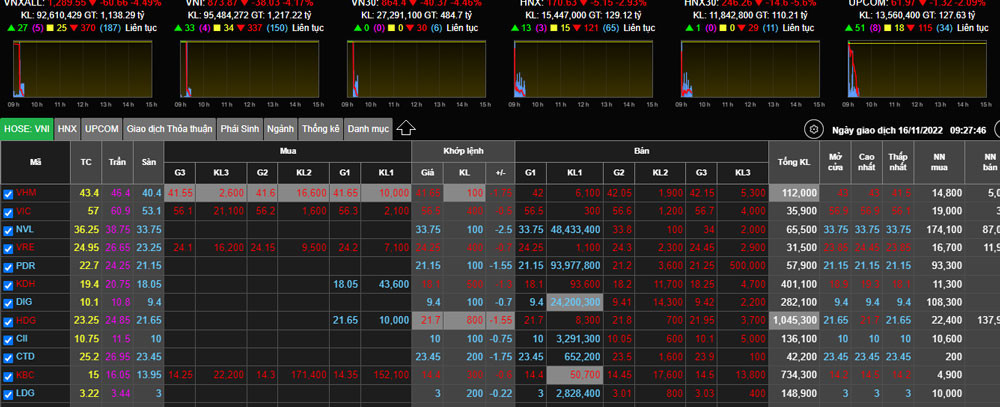 Sáng 16/11, hầu hết cổ phiếu bất động sản tiếp tục giảm sàn với dư bán rất lớn, lên tới hàng chục triệu đơn vị.