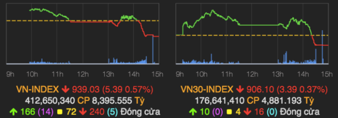 Tuy nhiên, áp lực chốt lời tại một số cổ phiếu vốn hoá lớn được kích hoạt vào giữa phiên khiến VN-Index xuống dần và mất sắc xanh trước giờ nghỉ trưa. Chỉ số giằng co quyết liệt quanh vùng 945 điểm vào buổi chiều, sau đó rơi nhanh trước phiên ATC. VN-Index đóng cửa tại 939,03 điểm, giảm 5,39 điểm.