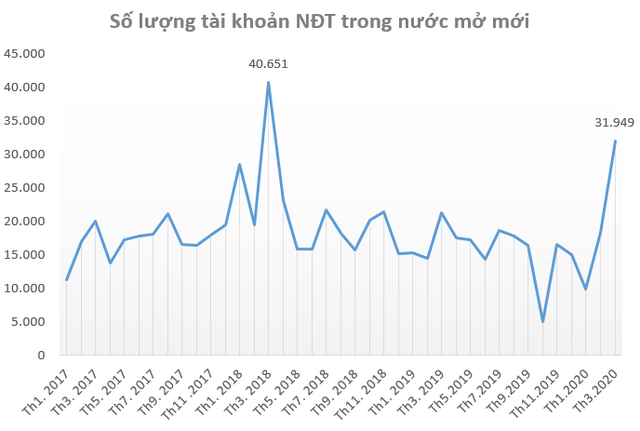 Số liệu từ Trung tâm lưu ký Chứng khoán Việt Nam (VSD) cho biết Nhà đầu tư trong nước đã mở mới 31.949 tài khoản chứng khoán trong tháng 3/2020, con số cao nhất trong vòng 2 năm qua. Trong đó, nhà đầu tư cá nhân mở mới 31.832 tài khoản và nhà đầu tư tổ chức mở mới 117 tài khoản.
