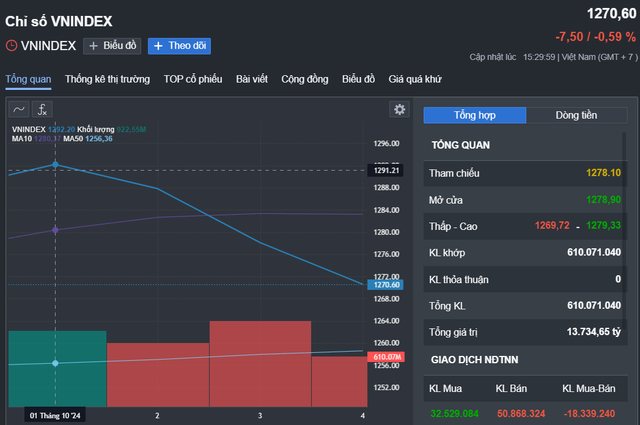 Trong tuần vừa qua, VN-Index đã gây chú ý khi vượt mốc 1.300 điểm trong phiên ngày 1-10. Không lâu sau đó, áp lực bán tăng mạnh trong hai phiên cuối tuần đã xóa tan hoàn toàn thành quả trước đó. Kết phiên giao dịch cuối tuần, VN-Index giảm 20 điểm, xuống mức 1.270 điểm.