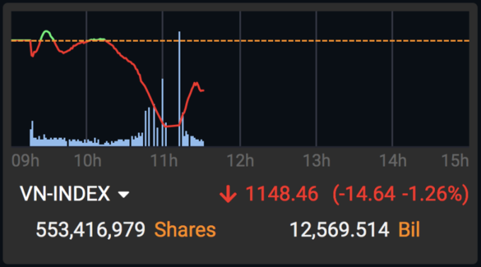 Áp lực bán kéo dài trong khoảng nửa tiếng, sau đó dịu dần nhờ lực cầu bắt đáy quyết liệt. Chỉ số nhờ đó thu hẹp mức giảm còn dưới 15 điểm vào cuối phiên sáng và nghỉ trưa tại 1.148 điểm.