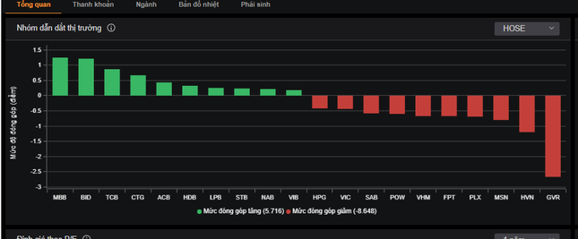 Ở chiều ngược lại, nhóm cổ phiếu tác động tiêu cực nhất lên chỉ số là GVR, HVN, MSN, PLX, VHM, FPT, POW, VIC, HPG.