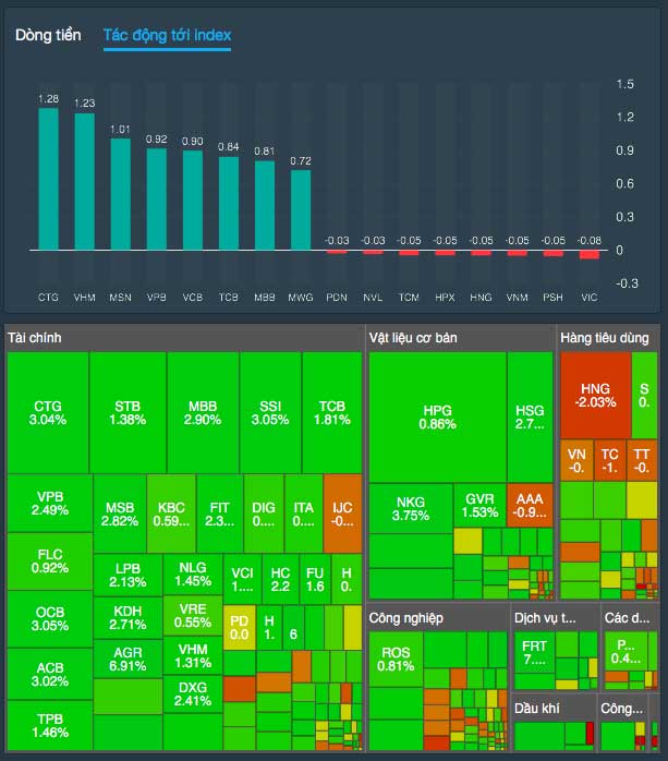 VHM, MSN, MWG và nhóm ngân hàng CTG, VPB, VCB, TCB, ACB, MBB, BID là những mã hoạt động tích cực nhất, đóng góp 8,5 điểm cho VN-Index. Ở chiều ngược lại, một số cổ phiếu lớn như VIC, VNM giảm giá nhưng không gây nhiều áp lực lên thị trường.