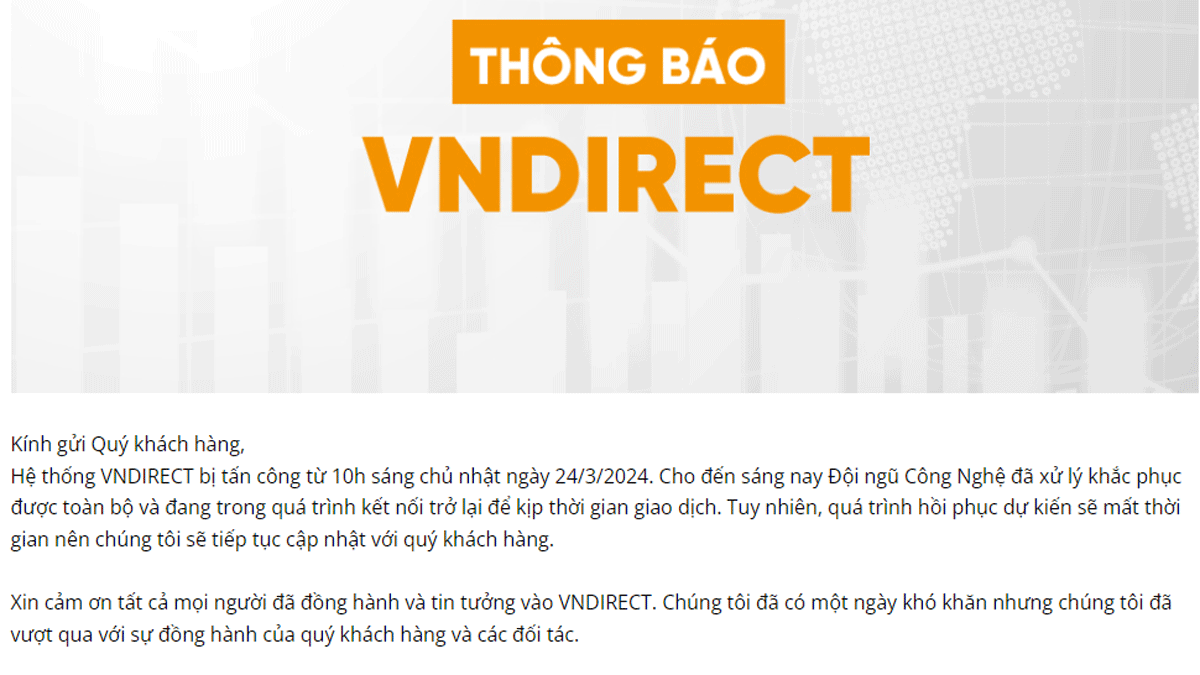 Sự việc xảy ra khi toàn bộ hệ thống của Chứng khoán VNDirect sáng 24/3 bị tấn công bởi một tổ chức quốc tế, dẫn đến nền tảng giao dịch của VNDirect bị tạm thời không truy cập được.
