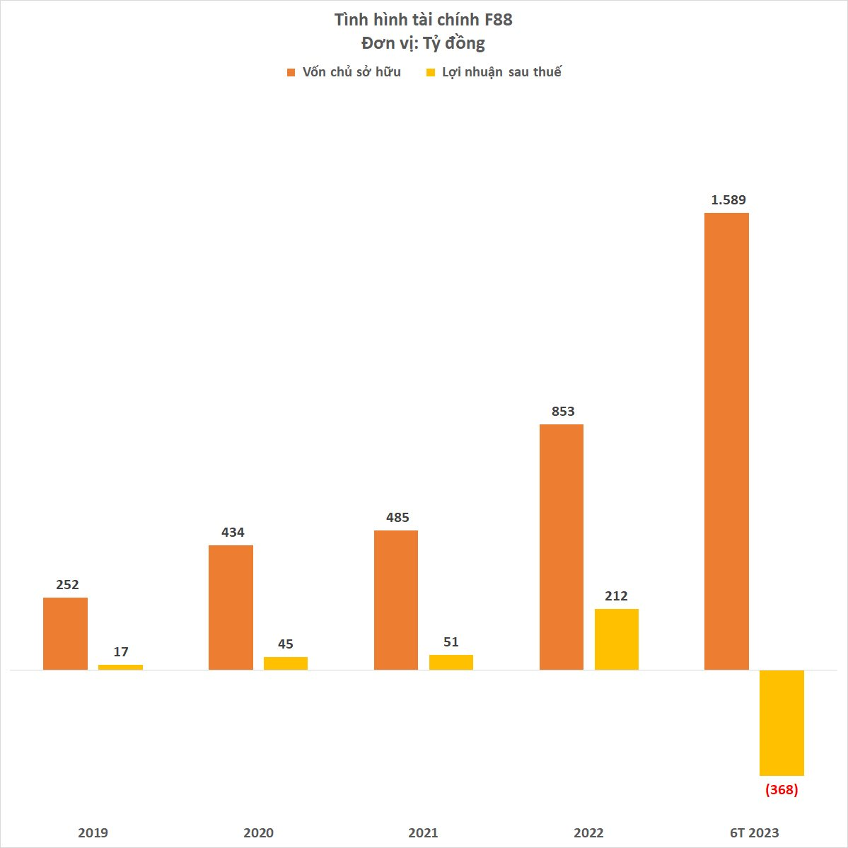 Theo đó, trong 6 tháng đầu năm 2023, F88 bất ngờ báo lỗ tới 368 tỷ đồng. Trước đó, trong 4 năm liên tiếp từ 2019 đến 2022, F88 đều có lãi và tổng lợi nhuận 4 năm đạt 324 tỷ đồng.
