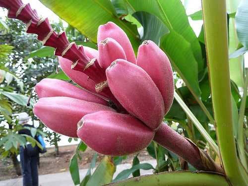 Quả chuối nhỏ nhắn, kích thước khoảng 7-8 cm, vỏ màu tím pha hồng, hạt nhỏ màu đen. Lá cây màu xanh thẫm, bóng đẹp. |