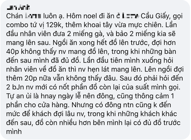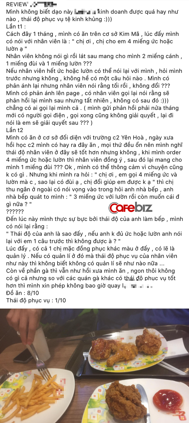 Mới đây, trên một hội nhóm review đồ ăn ở Hà Nội đã xuất hiện một bài viết phản ánh về thái độ thiếu chuyên nghiệp của nhân viên thuộc một chuỗi nhà hàng gà rán có tiếng trên địa bàn.