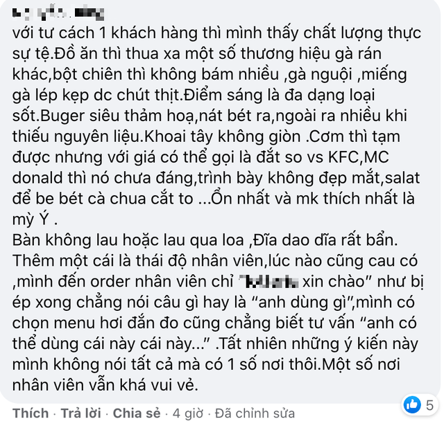 - Mình cũng đã tẩy chay L. rồi, gọi xuất cơm bảo đợi 10 phút mà cuối cùng cho đợi 45 phút. Mà vào 4 cửa hàng khác nhau mặt như đâm lê như mình ăn nợ ăn chịu ý, bye luôn dạo này mình qua KFC và hãng khác ăn luôn rồi khỏi quay lại chỗ bực mình.