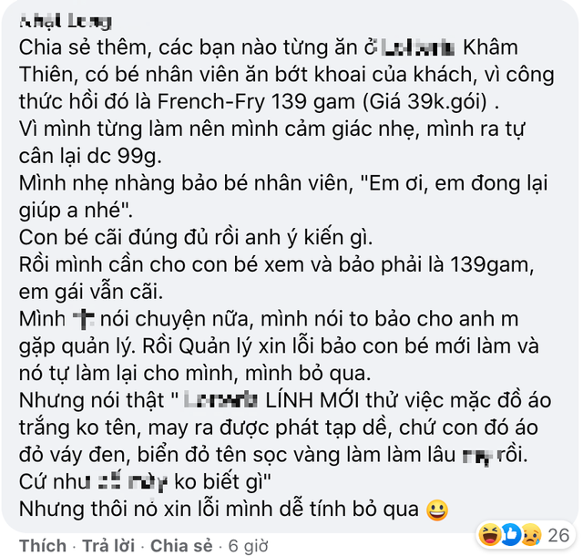 Nhưng khi mình ra hỏi: "Chị ơi , em gọi 4 miếng ức và lườn mà chị, sao lại có đùi ạ, chị đổi giúp em được không ạ?" thì chị thu ngân ở ngoài có nói vọng vào trong hỏi anh nhà bếp. Anh nhà bếp quát to mình: "3 miếng ức với lườn rồi còn muốn cái đ** gì nữa?"