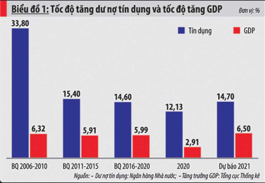 (2) Tốc độ tăng tín dụng liên tục cao hơn tốc độ tăng GDP, với hệ số khá cao như trên, nên dư nợ tín dụng/GDP giá thực tế liên tục tăng lên. Đây là một trong những yếu tố quan trọng góp phần làm cho tốc độ tăng GDP sau 3 năm xuống dưới mốc 6% từ 2015 đã vượt qua mốc 6%, đặc biệt trong 2 năm (2018, 2019) đã vượt qua mốc 7%, năm 2020 tuy tăng 2,91%, nhưng nằm trong số 10 nước đạt tăng trưởng dương (trong khi toàn cầu giảm 3,5%, các nền kinh tế phát triển giảm 4,9%, khu vực EURO giảm 7,2%, ASEAN giảm 3,7%...).