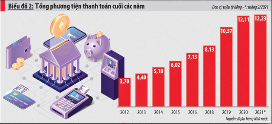 Có hai điểm đáng lưu ý. (1) Tổng phương tiện thanh toán liên tục tăng lên: Năm 2020 so với năm 2012 đã cao hơn gấp gần 3,3 lần, bình quân một năm tăng gần 18,5%. Đây là tốc độ tăng cao hơn tốc độ tăng tương ứng của dư nợ tín dụng (trên 2,6 lần và 14,9%/năm).