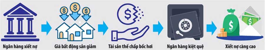 Đối với các tổ chức tín dụng cho vay bất động sản, khi giá bất động sản lên cao sẽ là thời cơ tranh thủ lúc giá cao để bán những bất động sản đang nắm giữ, nhưng vẫn tiếp tục cho vay. Trong khi bất động sản cần một lượng vốn rất lớn, tính thanh khoản rất thấp; khi vay, mức vay chỉ được khoảng 70% giá trị tài sản lúc giá cao. Đến khi giá xuống, lãi chồng lên vốn làm cho số tiền phải trả cao lên... Khi đó, vòng luẩn quẩn đối với việc vay vốn đầu tư vào bất động sản sẽ xuất hiện với mô hình.