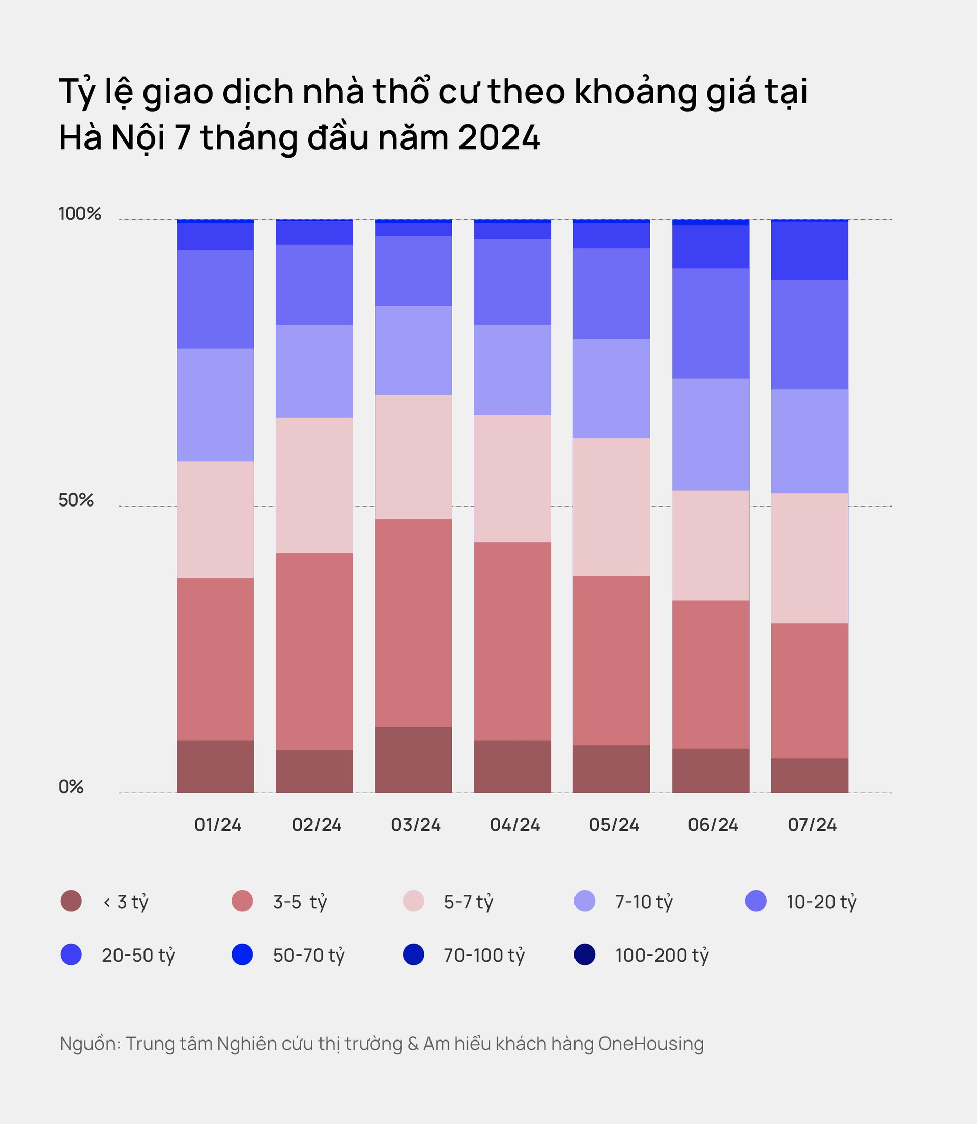 Cũng theo dữ liệu của OneHousing, xét về khu vực, khu Đông và Tây đang là tâm điểm của thị trường BĐS Hà Nội, với giao dịch thổ cư tại hai khu này chiếm tới 66% thị trường Hà Nội trong 6 tháng đầu năm 2024.