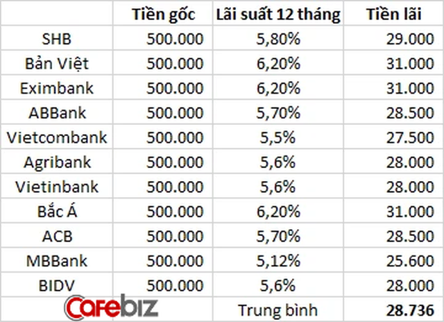 Tại thời điểm tháng 5/2021, lãi suất tiền gửi tiết kiệm kỳ hạn 12 tháng của 11 ngân hàng như SHB, Bản Việt, Vietcombank,... dao động từ 5,5-6,2%/năm. Theo tính toán giả định, nếu đem 500.000 tỷ đồng gửi tại ngân hàng SHB thì 1 năm sau sẽ nhận được 29.000 tỷ đồng. Trong khi đó nếu gửi tại Vietcombank, BIDV, Vietinbank thì số tiền lãi cuối kỳ nhận được khoảng 27.500 tỷ đồng. Tính trung bình mức tiền lãi có thể nhận được đạt khoảng 28.736 tỷ đồng.