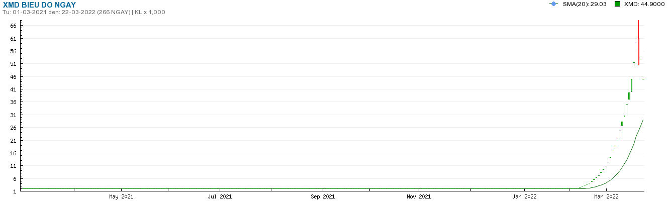 Trước đó nhiều tháng, mã cổ phiếu này không hề có bất kỳ giao dịch nào, nhưng đến ngày 11/2 đột nhiên tăng mạnh liên tiếp, đạt đỉnh vào ngày 17/3. Ngay sau đó, 3 phiên cổ phiếu này giảm sàn. Chốt phiên giao dịch ngày 22/3, cổ phiếu XMD đang ở mức 44.900 đồng/cp, giảm 24% so với mức đỉnh.
