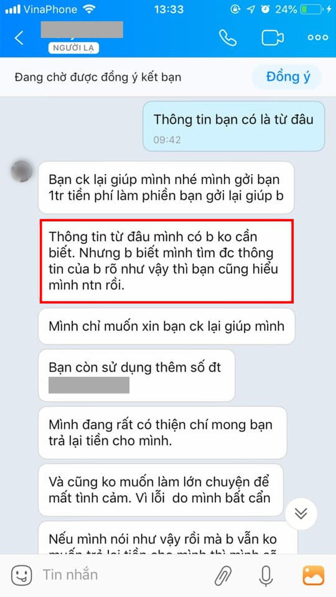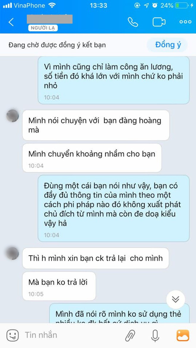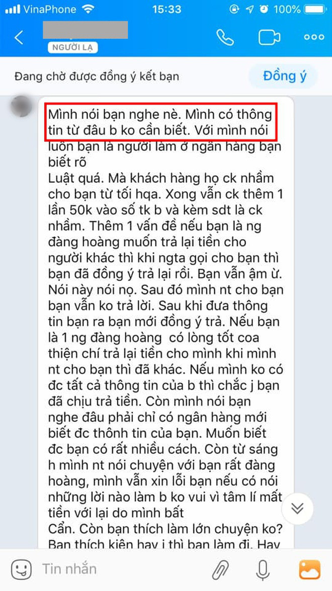 Chị viết trên MXH: "Điều em bận tâm là tại sao người ta lại có được toàn bộ thông tin của em hay vậy, biết luôn cả số điện thoại cũ em đã bỏ cách đây vài năm. Điều đáng nói nữa là em cũng không nhận được cuộc gọi nào xác nhận từ ngân hàng cả hai phía rằng mình có nhận nhầm một khoản tiền.