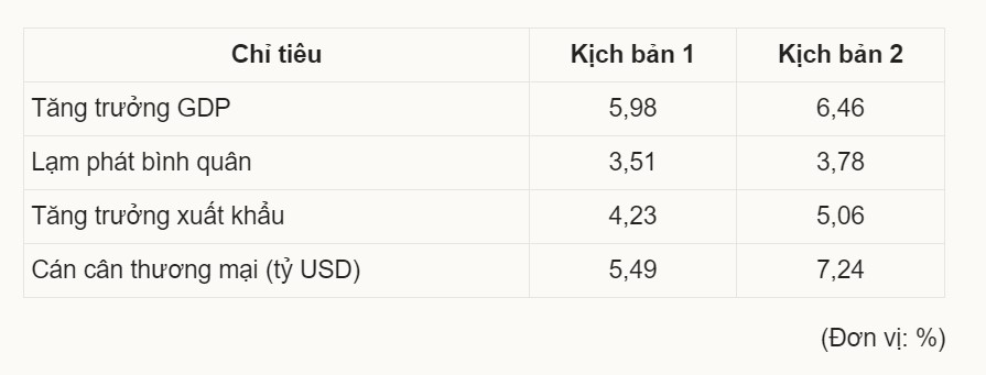 Chỉ tiêu Kịch bản 1 Kịch bản 2 Tăng trưởng GDP 5,98 6,46 Lạm phát bình quân 3,51 3,78 Tăng trưởng xuất khẩu 4,23 5,06 Cán cân thương mại (tỷ USD) 5,49 7,24 (Đơn vị: %)