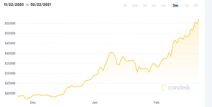 Đà tăng giá của Bitcoin đã lên một tầm cao mới. Giá đồng tiền ảo này vượt 20.000 USD lần đầu tiên hồi tháng 12/2020. Tuần trước, nó phá mốc kỷ lục 50.000 USD. Hôm qua, đồng tiền này còn lên đỉnh hơn 58.200 USD và hiện được giao dịch quanh khoảng 55.000 USD.