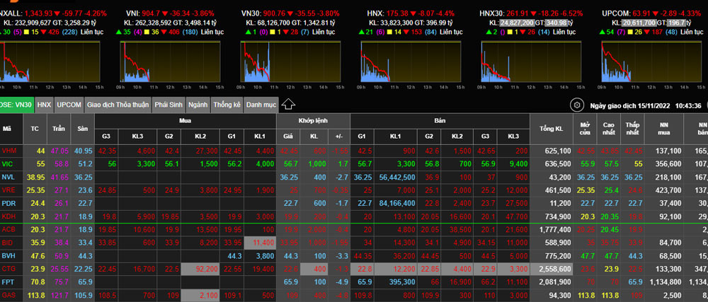 Thị trường chứng khoán Việt Nam tiếp tục giảm giá rất mạnh. Chỉ số VN-Index sáng 15/11 có lúc về sát ngưỡng 900 điểm, thấp hơn nhiều so với đỉnh cao hơn 1.520 điểm ghi nhận hồi đầu tháng 4/2022.