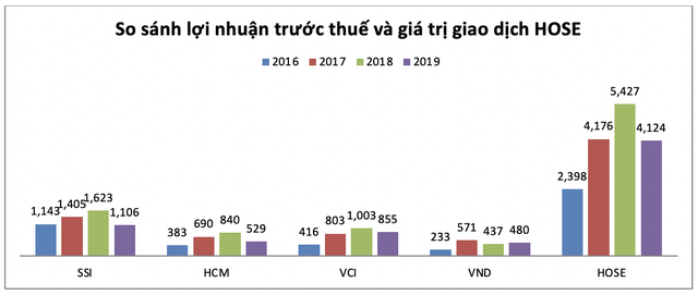 Tuy nhiên nếu nhìn cận cảnh có thể thấy nhiều điều thú vị phía sau số liệu thống kê. Giai đoạn 2016-2018 giá trị giao dịch tại HOSE tăng hơn 2 lần nhưng chỉ có lợi nhuận của VCI, HCM và VND tăng ở mức tương ứng. SSI, CTCK lớn nhất thị trường dù lợi nhuận vượt 1.000 tỉ nhưng sự biến thiên không nhạy như thị trường. Năm 2019 khi thanh khoản tại HOSE giảm sút tụt xuống ngang bằng với mức năm 2017, trừ VCI duy trì lợi nhuận khả quan, 3 CTCK còn lại lợi nhuận tụt giảm về dưới cả mức năm 2017. Điều này cho thấy lợi nhuận của các CTCK theo xu hướng nhưng không hẳn tỉ lệ thuận với giá trị giao dịch của thị trường, giá trị giao dịch tăng vọt không hẳn các CTCK đã lãi to.