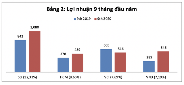 Theo công bố của HOSE, năm 2020 SSI, HCM, VCI và VND tương ứng chiếm 12,33%, 8,66%, 7,69% và 7,19% thị phần môi giới và chứng chỉ quỹ tại sàn này. Thống kê cho thấy thị phần môi giới không hẳn quyết định lợi nhuận to nhỏ. Đơn cử, VND thị phần chung cuộc hạng 4 trong nhóm nhưng lợi nhuận 9 tháng đầu năm chỉ đứng sau SSI. Ngược chiều, HCM thị phần thứ 2 nhưng về lợi nhuận xếp sau VND và VCI (Bảng 2).