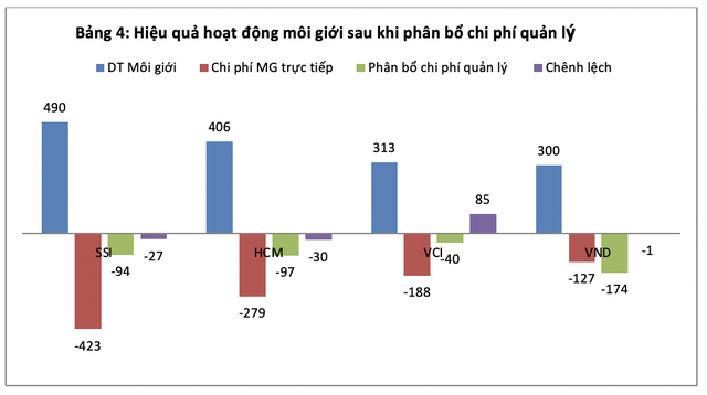 (Tỷ lệ phân bổ dựa trên giả thuyết quản lý danh mục margin của một công ty chứng khoán với quy mô 6-10 ngàn tỷ sẽ không cần quá 30 nhân sự do khả năng tự động hóa cao). Sau khi phân bổ chỉ VCI "có lãi" thực sự từ môi giới chứng khoán, VND thành lỗ (nếu phân bổ 70% chi phí chung cho môi giới thì VND lãi 20 tỉ). Hai CTCK dẫn đầu thị phần môi giới tại HOSE là SSI và HCM "lỗ" trong hoạt động môi giới. Nghịch lý xuất hiện thị phần càng lớn, CTCK càng "lỗ"!