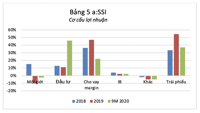 Với SSI lợi nhuận từ mảng kinh doanh trái phiếu đóng góp tỉ trọng lớn năm 2019 và 2020. Thuyết minh báo cáo tài chính của SSI cho thấy CTCK này nắm giữ các danh mục cổ phiếu sẵn sàng để bán (FVTPL) của các công ty đầu ngành, đang hoạt động tốt về các ngành bán lẻ, bất động sản, nguyên liệu. Danh mục đầu tư nắm giữ dài hạn với vốn đầu tư hơn 400 tỉ đồng của SSI phân bổ vào PAN Farm, Con Cưng và một số cổ phiếu niêm yết và chưa niêm yết - được nhận định khó kỳ vọng tạo ra sự đột biến lớn.