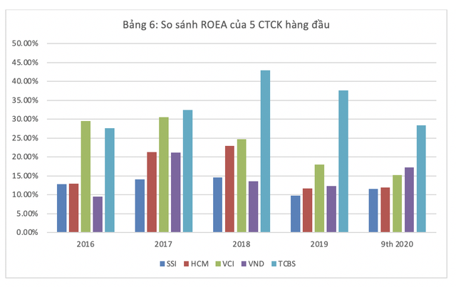 Một trong các chỉ số quan trọng nhất đánh giá hiệu quả hoạt động của một công ty là lợi nhuận/vốn chủ sở hữu (ROEA). Ở nhóm CTCK niêm yết, VCI có tỷ suất ROEA ổn định nhất ở mức 20-30%. SSI, HCM và VND có một số thời điểm tiệm cận hoặc vượt 20% nhưng đa phần dưới ngưỡng này.
