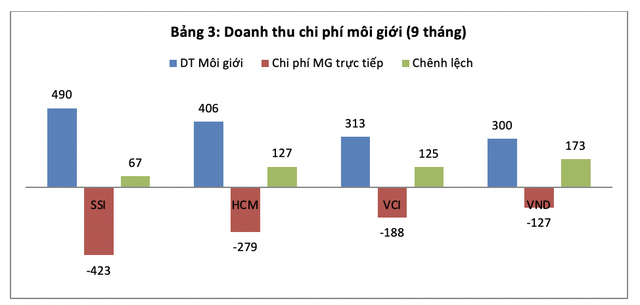 Tại SSI, HCM, VCI, VND con số chi phí quản lý chung trong 9 tháng đầu năm 2020 lần lượt là 134, 138, 57 và 218 tỉ đồng. Ngoại trừ VCI có bộ máy hoạt động gọn nhẹ chi phí quản lý chung thấp, VND có chi phí quản lý chung cao vọt so với SSI và HCM. Nếu phân bổ 70% chi phí quản lý chung cho hoạt động môi giới (đội ngũ môi giới thường chiếm 50% - 90% nhân sự các CTCK) cho SSI, HCM và VCI, 80% cho VND thì ta có số liệu ước lượng ở bảng 4.